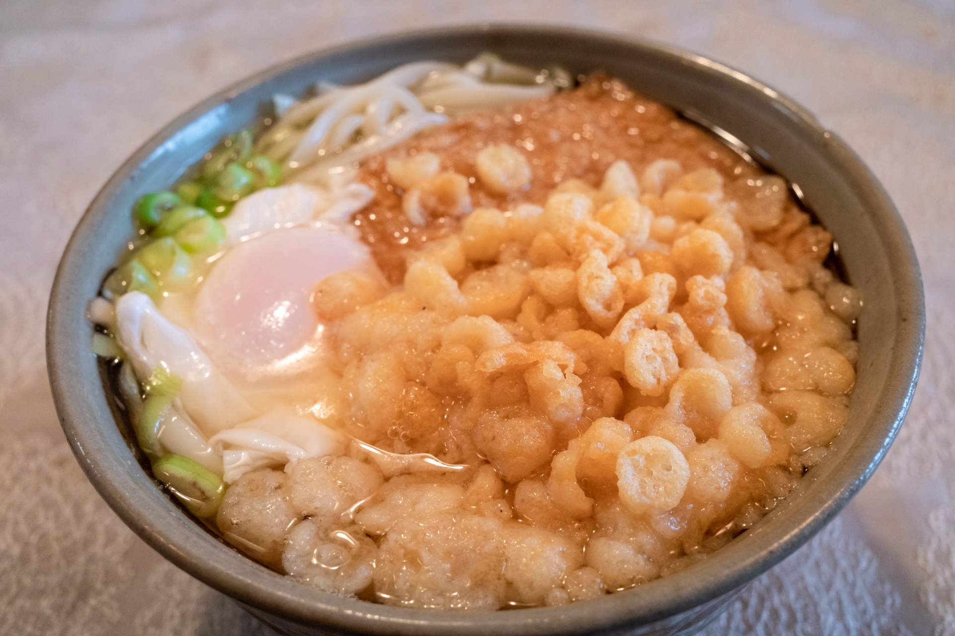 むじなそばの最大の特徴は、そのトッピングにあります。甘辛く味付けされた油揚げと、サクサクの天かすが蕎麦の上に乗せられます。これらのトッピングは、蕎麦の風味を引き立て、食感のバラエティを加えます。